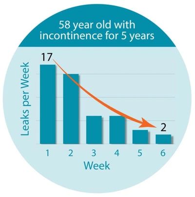 ELITONE has been tested in clinical studies reviewed by the FDA. In one study 95% of women reported fewer leaks, with an average reduction of 71% in only 6 weeks. Naturally, reduction in pad use occurs over multiple weeks of consistent use. In one example, as shown in the graph, a woman improved from 17 accidents per week to only 2.